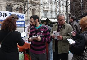 一位中国同胞经过这里,远远看到了横幅,便穿越广场前来观看,他接过学员手中的《九评共产党》光盘和真相报纸。当他看到很多人在签字声援支持法轮功反迫害,非常感慨地说:“没想到有这么多正义人士支持中国人权,××党真的是太坏了!我盼着看到它早日垮台。”他并马上声明了三退(退出邪党及其团、队组织)。