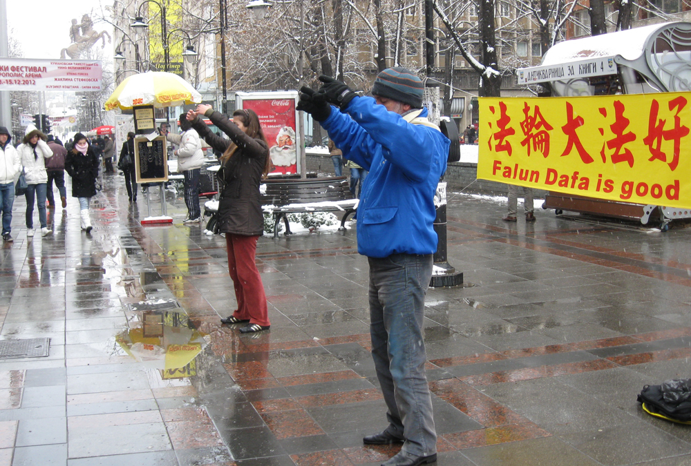 十二月十一日下午,学员在斯科普里市中心步行街——马其顿大街的特丽莎博物馆前拉开了横幅,在优美的炼功音乐下演示功法,散发真相传单。有不少当地人接了真相传单后迟迟不愿离去,在一旁静静地看功法演示,也有人把传单放在兜里,表示回家后再仔细阅读了解。有不少中学生在认真观看功法演示,饶有兴趣地打听这是什么功法?一位参观特丽莎博物馆的女士顺着炼功音乐声找到大法弟子,问了情况,要了传单,表示自己要认真了解法轮大法。