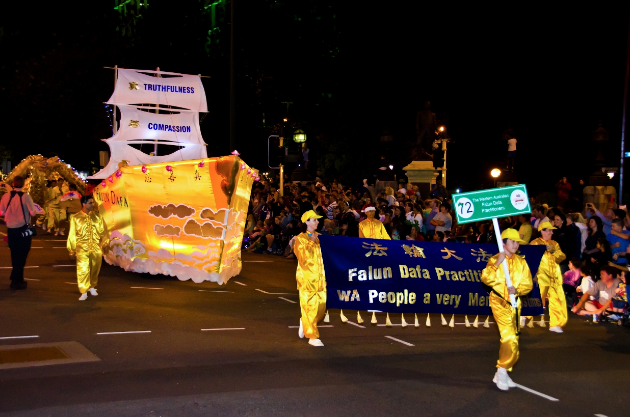 【明慧网二零一二年十二月二十三日】(明慧记者林仁德珀斯报道)西澳法轮功团体于二零一二年十二月十五日参加了珀斯市的圣诞大游行。这是澳洲西部最大规模的游行。当晚的游行,据第二天当地的媒体报道,约有二十五万人来到现场观赏,近西澳人口的八分之一。