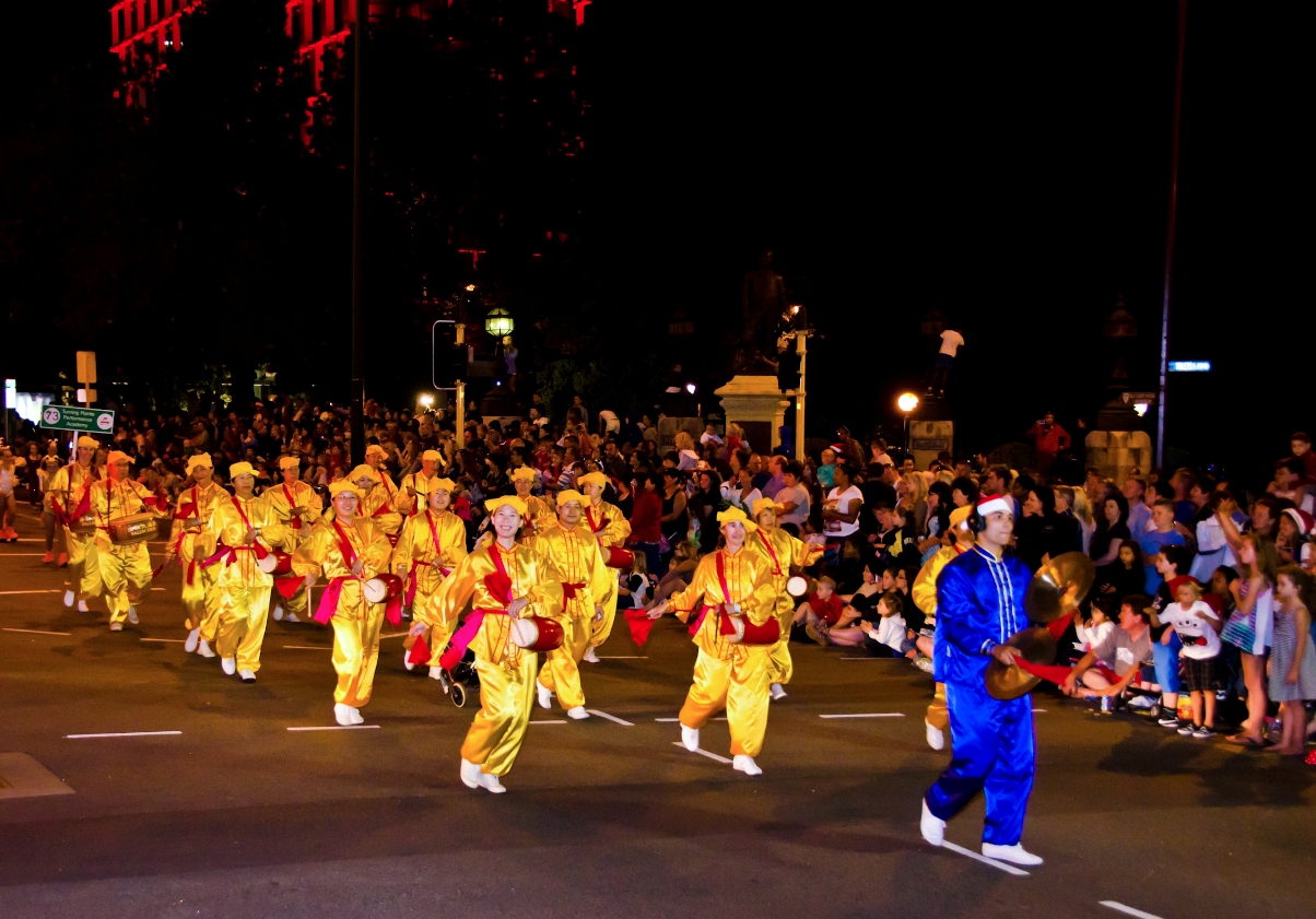 “还有他们的腰鼓队!这都是他们游行队伍的一部份。法轮功团体祝珀斯市的民众圣诞佳节快乐。我们感谢他们的参与,他们还自己建造了一艘船。他们今晚在珀斯市的街上看上去真是令人喜爱!”