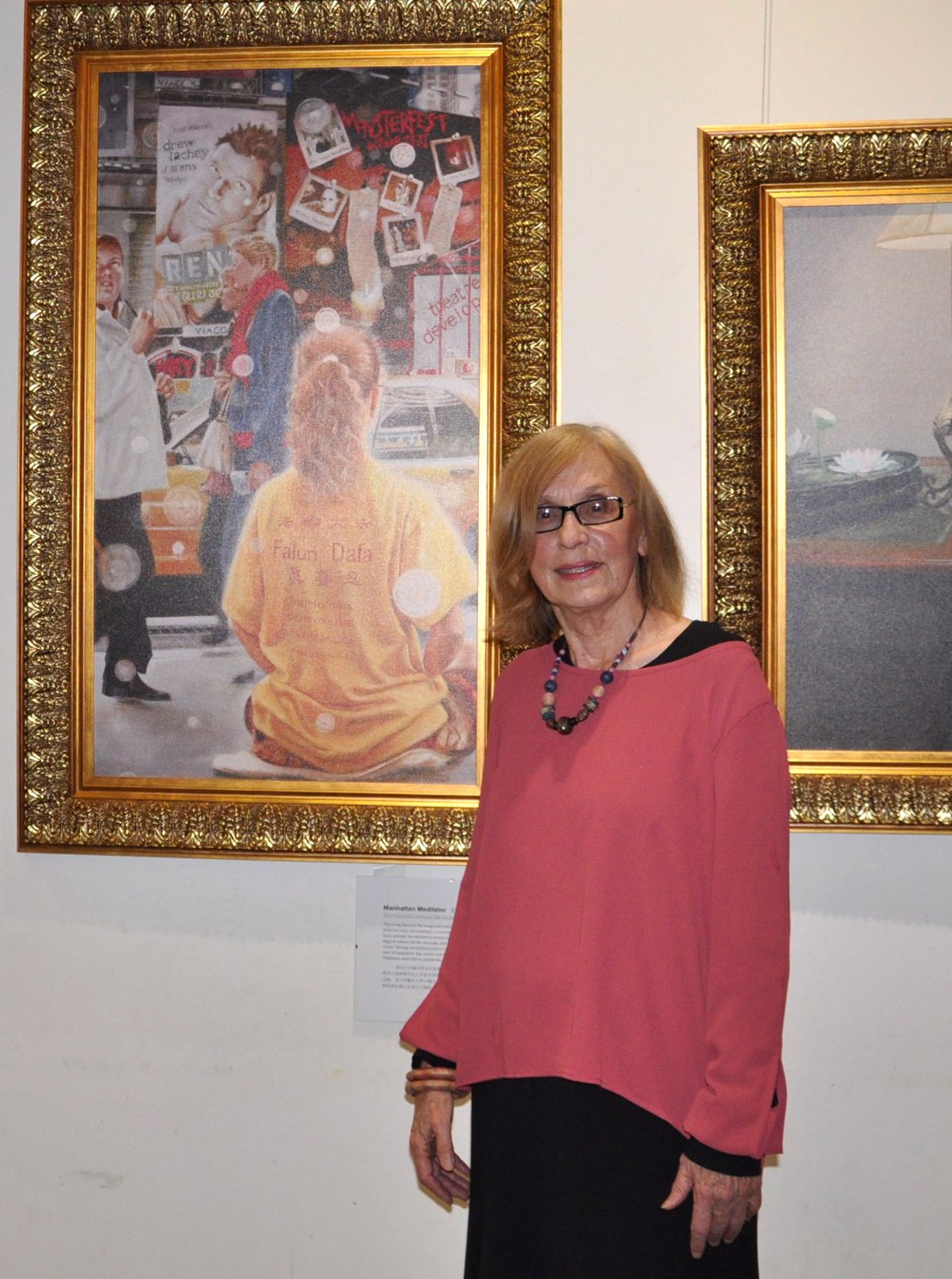 ![]() 加拿大画家吉利丝在其画作《曼哈顿的关注》前 |