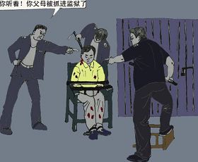 涞源县涞源镇水云乡法轮功学员侯曼云上小学的儿子,在家里一听到敲门声,心里都紧张得“咚咚”直蹦,过去一幕幕可怕的场景早印在他脑子里,七八岁的时候,警察凶狠地把爸妈绑架,骂骂咧咧,还抢了不少钱,他和另一个孩子也被带走,警察威胁说:“你们炼不炼法轮功?炼把你们也关进去!”孩子被吓坏了,也弄不懂,他们怎么和电视上保护人民的警察叔叔不一样呢?打这以后,孩子心中的警察就和绑匪画上了等号。