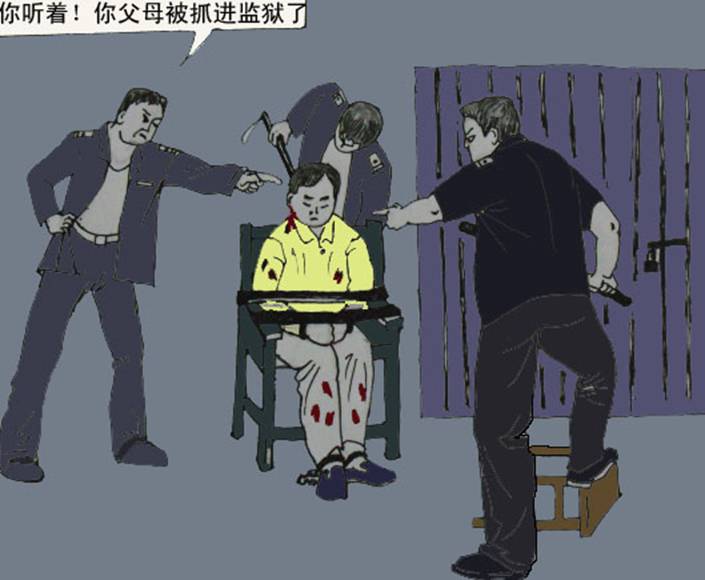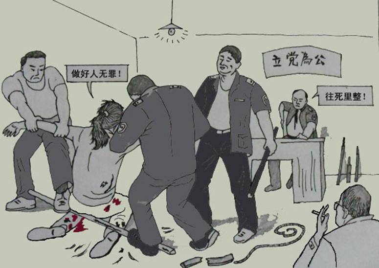 “他们把我拉倒,有一个打手说,他有办法让我走,接着用烟头烫我的脚心,他们又拉又拽把我们拽到了看守所,搜走了我们一百二十元钱,还让刑事犯看着我们。第四天晚上又把我提到二楼,打手们把我捆在椅子上,拿我的凉鞋底盖我,鞋底盖折了,又拿绳子蘸水抽我,累得他们直冒汗,他们换了别的招,拿铁棍从膝盖一直梆到脚面,还用肥皂抹眼,又折腾了大半夜。”