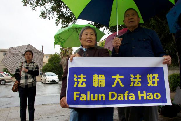 据南加州KPCC电台二月十五日报导,七十多名南加州法轮功学员冒雨在中共驻洛杉矶领事馆前集会,抗议中共对法轮功长达十二年的迫害。