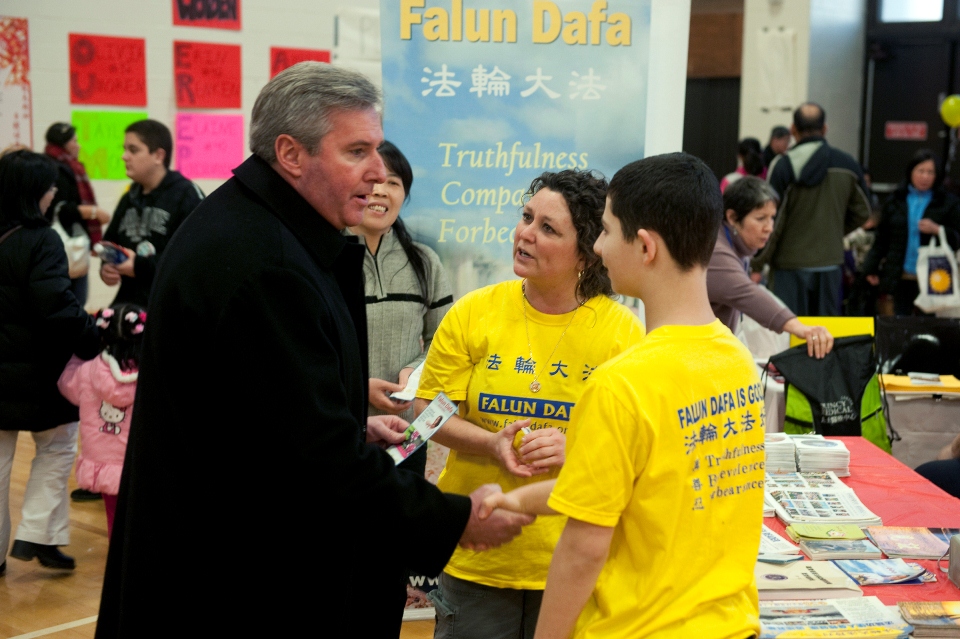麻州众议员艾尔斯在法轮功学员的摊位前驻足观赏法轮功学员炼功,并聆听法轮功学员介绍法轮功和大法被中共迫害的事实。他鼓励年轻的法轮功学员鲍比坚持自己的信仰。