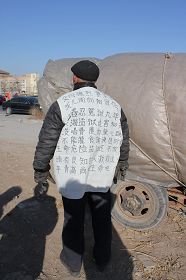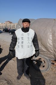 中午人少时,警察又来捣乱,因老父亲他们开的拖拉机上也贴着反迫害的条幅,恶警们企图强行撕下,让老父亲脱下状衣,撵老父母亲走。