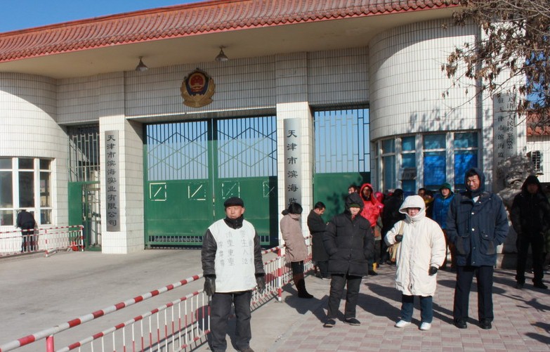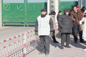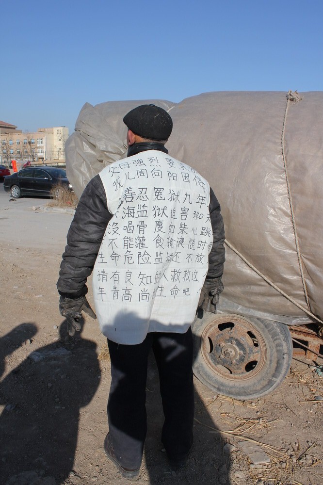 二零一二年二月十七日,周向阳的老父亲在再次要儿子无结果的情况下,穿上状衣站在滨海监狱门口,等待监狱能尽快答复。周向阳父母是经过一天半的奔波,驾驶自家的手扶拖拉机到达天津市港北监狱(现更名为滨海监狱)的。