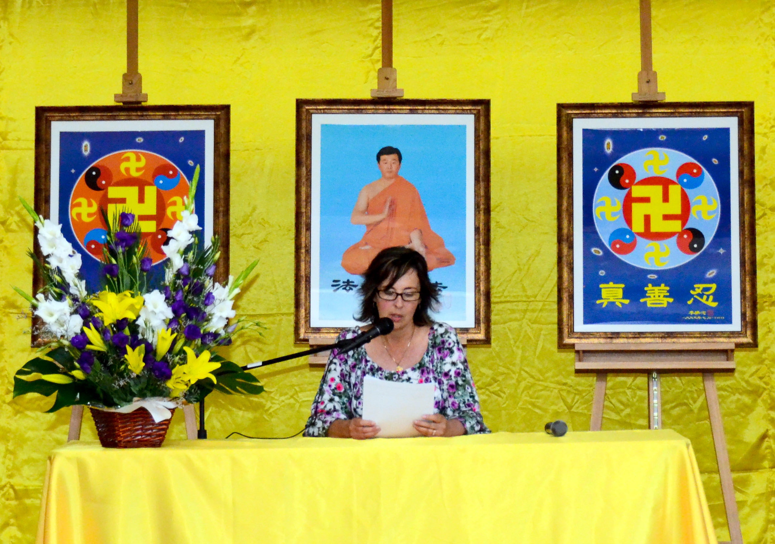 首先在交流会上发言的嘉娜分享了她在西澳西南地区,多次举办“真善忍”美展过程中不断去掉人心、提高心性、增强正信的经历。她在交流中说:“在开画展的期间,当没有人進来看画时,我就会发正念,并请师父把所有的众生带進来,使他们能够得到救度。通常在几分钟之内,有时会有多达二十人同时進来。在画展的最后一个礼拜,当我单独一个人照看场地时,师父就会安排世人三三俩俩地進来,这让我有充裕的时间和每一个人讲话。真的是这样,我只要求师父,师父就会安排。”