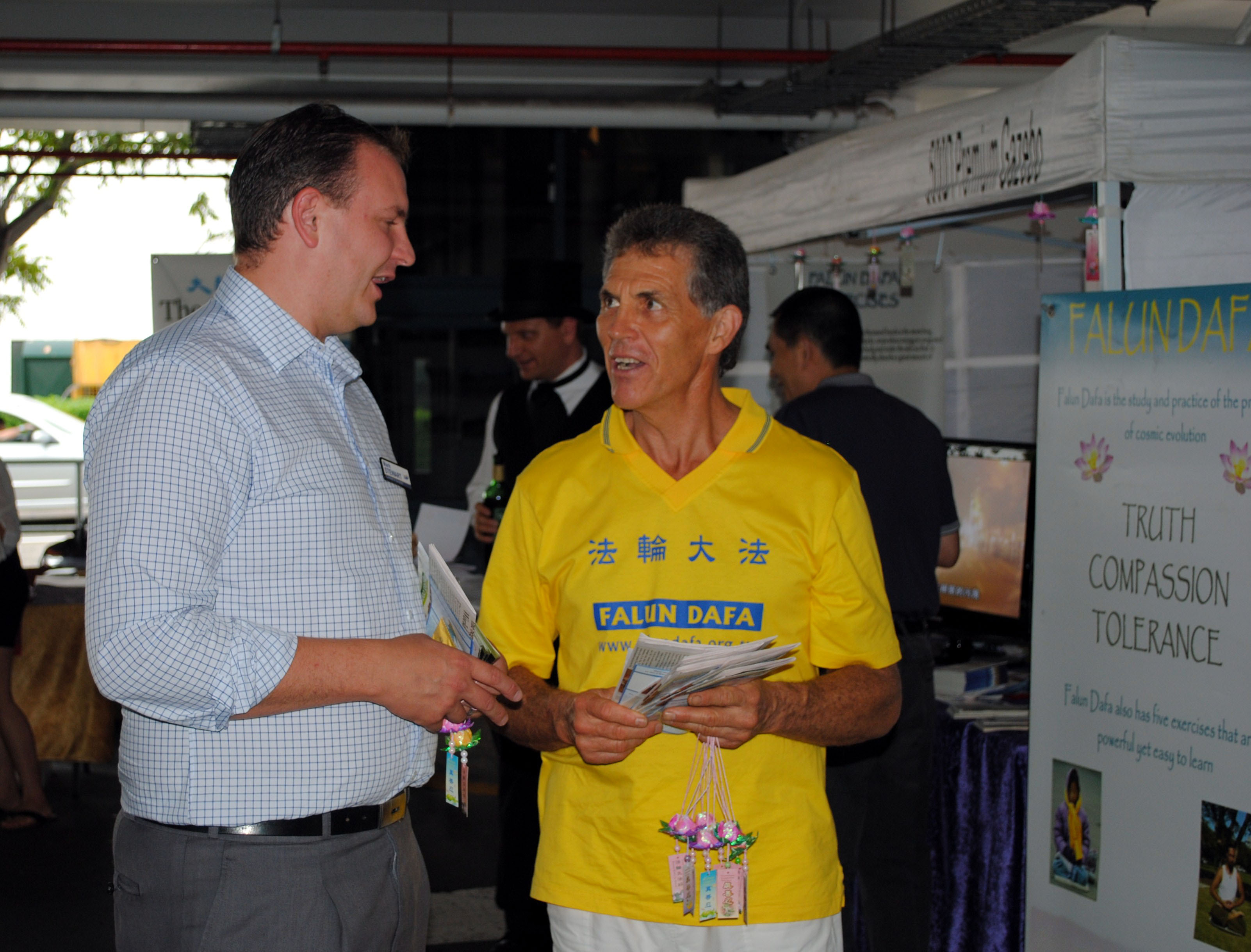 澳洲国家自由党(LNP)新利班(Sunnybank)选区的候选人斯特瓦特(Mark Stewart)与布里斯本法轮功学员交谈。