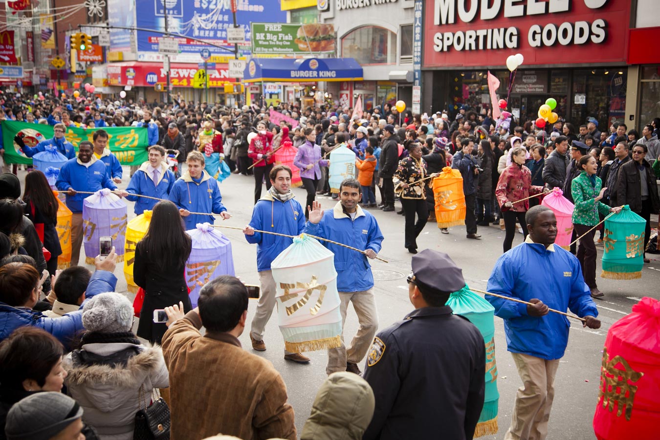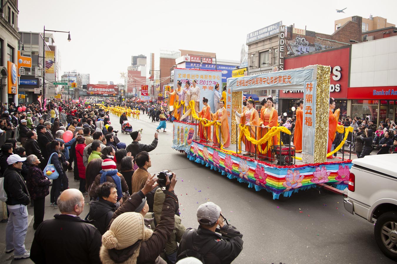 【明慧网二零一二年二月五日】(明慧记者采菊纽约报道)二零一二年二月四日立春,纽约法拉盛街头一片喜气洋洋。街道两边挤满了人,大家满面春风,争睹法拉盛新年游行的盛况。法轮功学员的游行队伍以其壮观多姿的阵容,明亮美丽的色彩,发自肺腑的祝福赢得了众人的热烈欢迎。