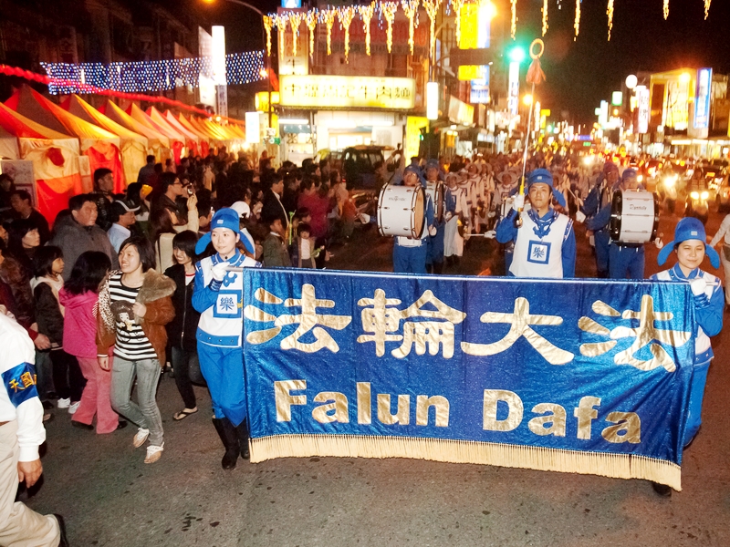 【明慧网二零一二年二月六日】黄历正月十五是元宵节,俗称小过年,小孩提灯笼、赏花灯、猜灯谜、看艺文表演。“树林之美新春嘉年华灯会”一直是台湾树林各界民众期待的年度盛事,系列活动于二零一二年二月一日起至七日一连七天,展出各式花灯,艺文才艺表演及民俗技艺、美食摊位等,热闹非凡。四日晚间的踩街活动,法轮大法天国乐团应邀参加,壮观的队伍让当地民众惊喜不已,主办单位表示:“你们(法轮功)真的太棒了。”