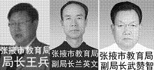 张掖市教育局完全听命于张掖地区610的指挥,做出了不符合教育体系职业道德之事,张掖市教育局的负责人,完全丧失了良知,给广大在校学生、教师、学生家长灌输谎言、培养对法轮功仇视的心理,造业甚大,如果不知悔改,不知弥补,善恶有报的天理就会在世间展现。