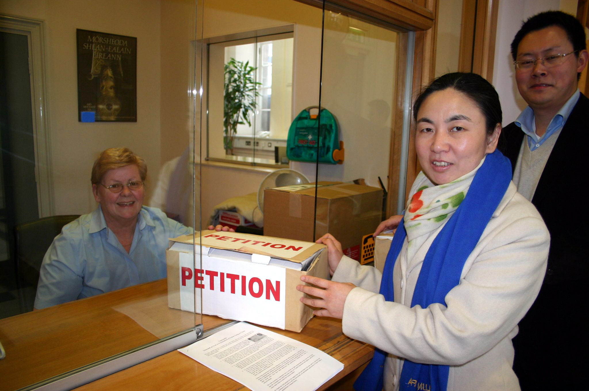 ![]() 法轮功学员代表把二万多个爱尔兰民众的签名信递交总理府,呼吁总理访华时提出法轮功受迫害问题 |