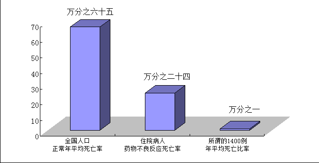 退一万步,先不说这1400例如何经不起推敲,就假定这1400例是真的,就假定全国炼法轮功的人数是中共迫害开始时所谓的仅有二百万人(实际上,一九九八年官方公布全国约有七千万到一亿人炼法轮功),从一九九二年到一九九九年,按中共造谣的死亡1400例算,平均一年两百人,即所谓的炼法轮功死亡的年平均死亡率仅为万分之一;而根据《中国统计年鉴1996》,在一九九零年到一九九六年七年中,全国人口正常的年平均死亡率为万分之六十六,大大高于所谓的炼法轮功死亡的年平均死亡率;而据国内医药学专业期刊提供的数字,住院病人中因药物不良反应而死亡的死亡率至少是万分之二十四,也远远高于法轮功修炼者万分之一的年平均死亡率。退一万步说,假定这1400例是真的,那么它恰恰证明了法轮功在祛病健身方面的奇异功效,而不是其它。