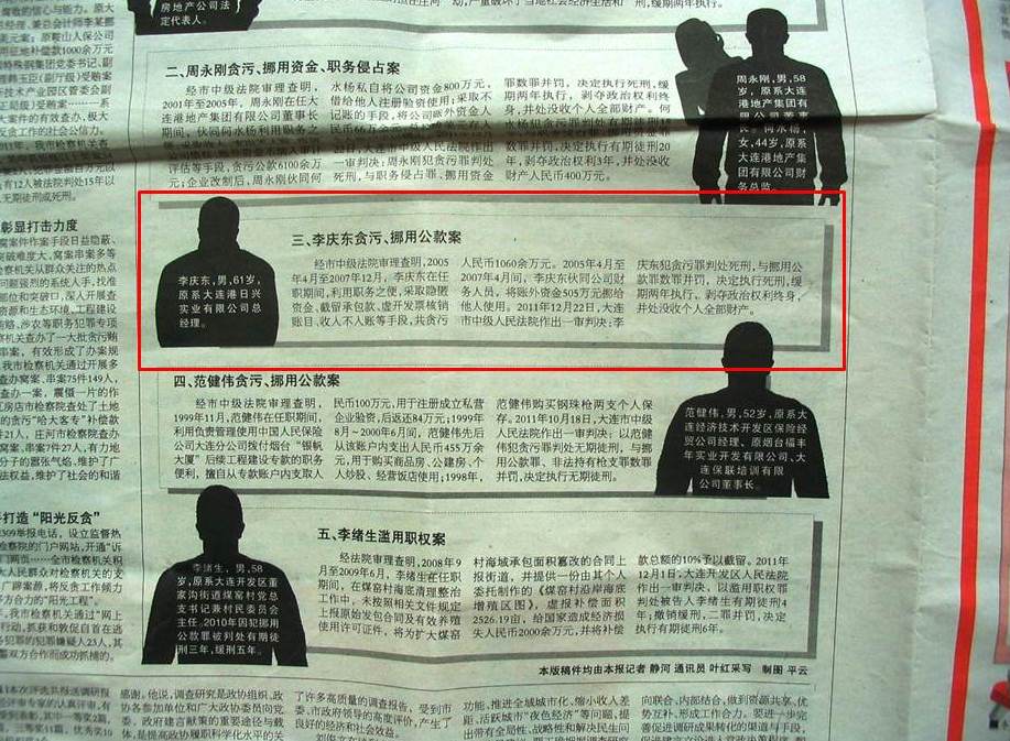 以下是从报纸上截取的李庆东案的原件,红色方框内是李庆东案的审理结果。