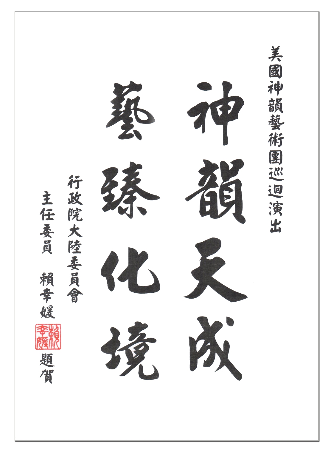 ![]() 行政院大陆委员会主任委员赖幸媛也赠送“神韵天成、艺臻化境”的贺词 |