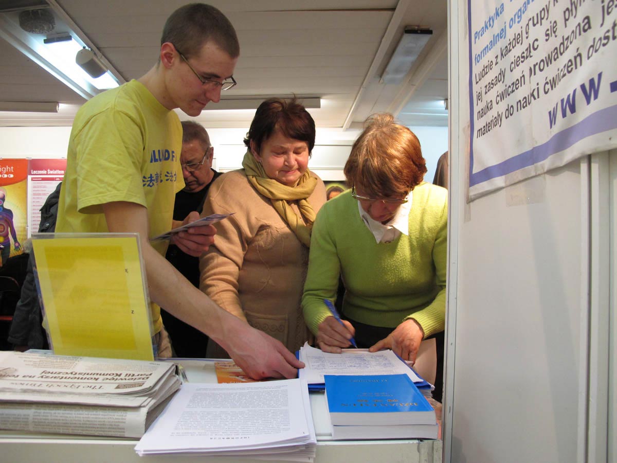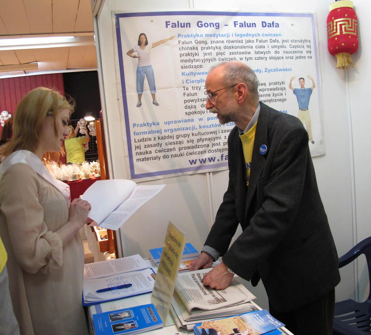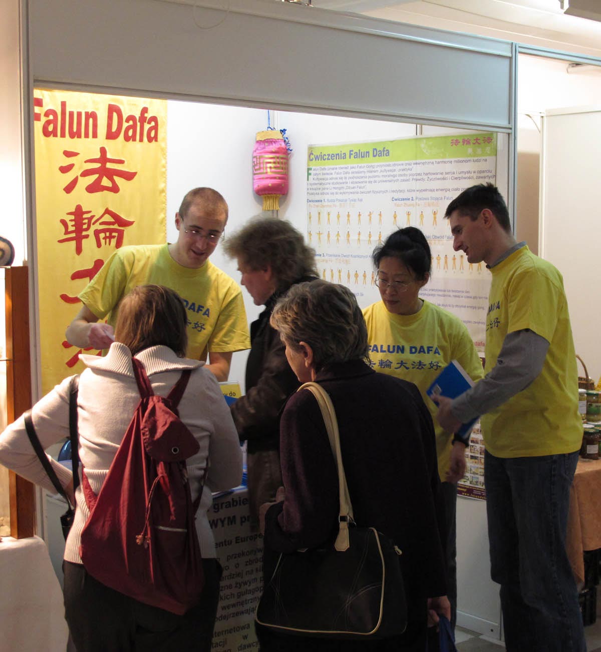 在博览会上还有很多人再三询问何时开始学炼法轮功功法,他们虽然下载了炼功视频和音乐,也自学过了,但还是感觉不踏实,还是到博览会上再学一遍,并留下联系电话请求组建炼功点。还有很多人购买法轮功主要著作《转法轮》,甚至在博览会上参展的商家也抽空过来请一本,法轮功学员随赠每位有缘人一朵带有“法轮大法好”字样的吉祥纸莲花,以及介绍法轮大法主要著作《转法轮》的波兰语书签,有些女士把纸莲花别在手提包上,而男士们就别在西装上衣口袋上,大家都带着笑容再三说谢谢。
