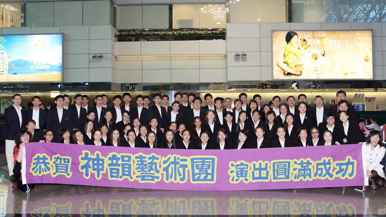 美国神韵纽约艺术团四月九日下午一时将启程至澳洲墨尔本展开纽澳的演出,在台湾桃园机场合照。