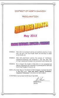 【明慧网二零一二年四月十四日】二零一二年四月十日,加拿大卑诗省萨尼奇北部地区(District of North Saanich)向加拿大法轮大法学会颁发褒奖,宣布二零一二年五月为“法轮大法月—颂扬真、善、忍”。