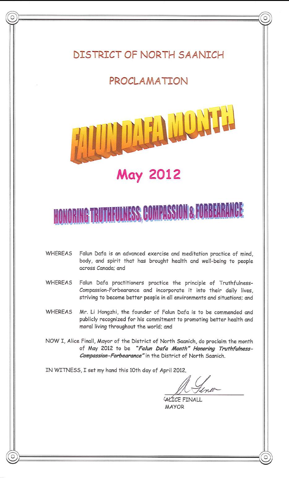 因此,我,艾丽丝·法诺(ALICE FINALL),萨尼奇北部地区市长,在此宣布二零一二年五月为萨尼奇北部地区的“法轮大法月—颂扬真、善、忍”。