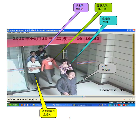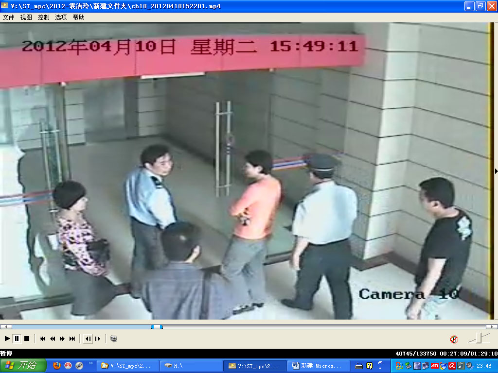 二零一二年四月十日下午四时左右,中共 “六一零”人员再一次非法带走他。从生活区的监控录像中可辨认出(见上图),参与人员有市“六一零”人员伍海鸥、市政法委人员赖鸿(女)、国保人员李健(女)、派出所警员苏某和一位不知姓名的男士,共五人(见所附监控录像图片)。