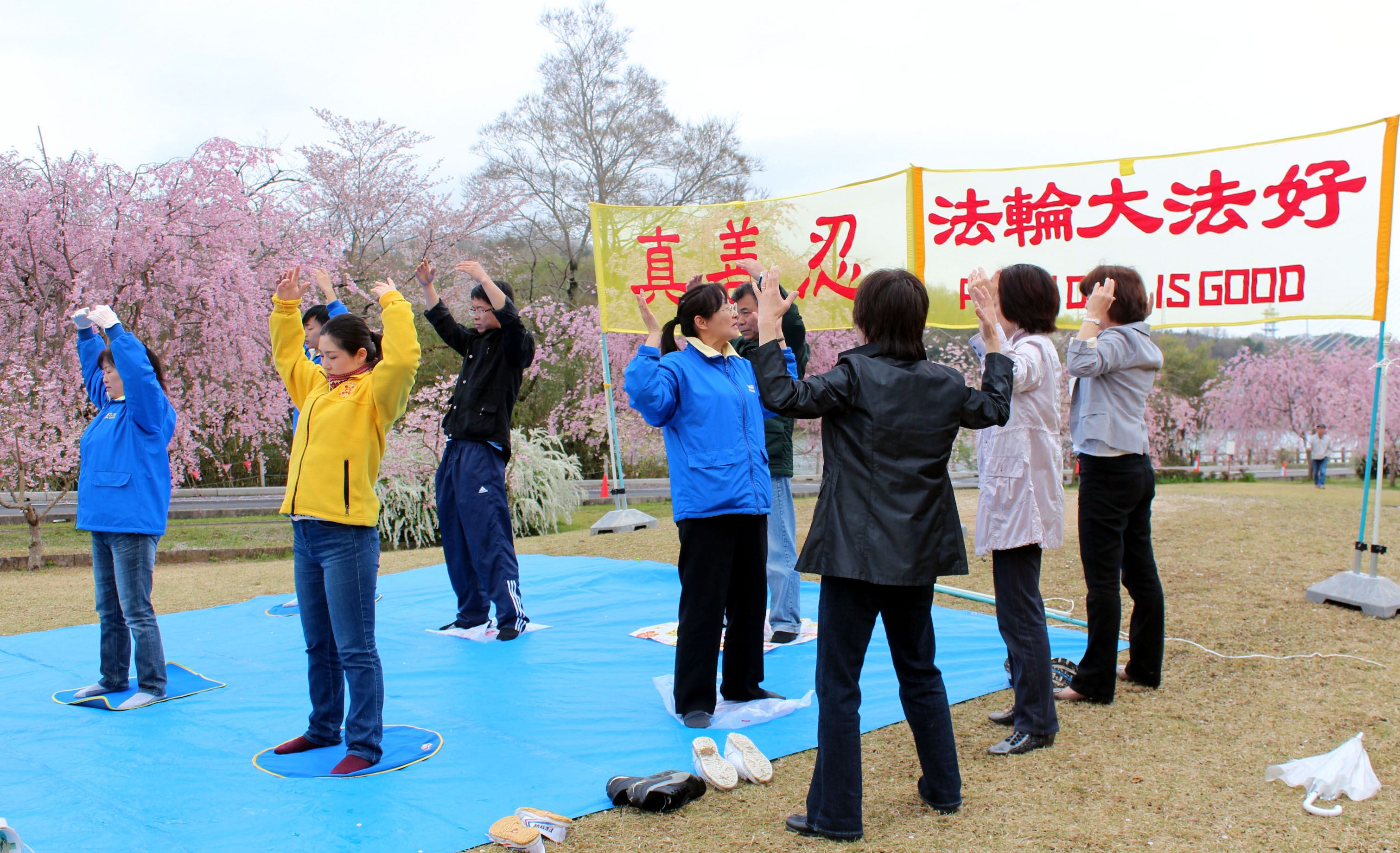 【明慧网二零一二年四月十八日】二零一二年四月十四、十五日两天,日本法轮功学员继上个周末连续参加了爱知县丰田市水源公园(Suigen Park of Toyoda-City,Aichi-Pref.)的第二十届樱花节。