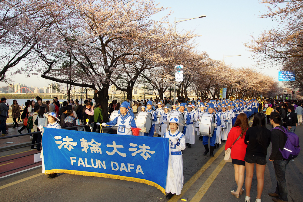 【明慧网二零一二年四月十九日】四月十五日,韩国法轮功学员组成的天国乐团和功法演示团(炼功队)参加了二零一二年汉江汝矣岛春花庆典,受到了市民们的热烈欢迎。