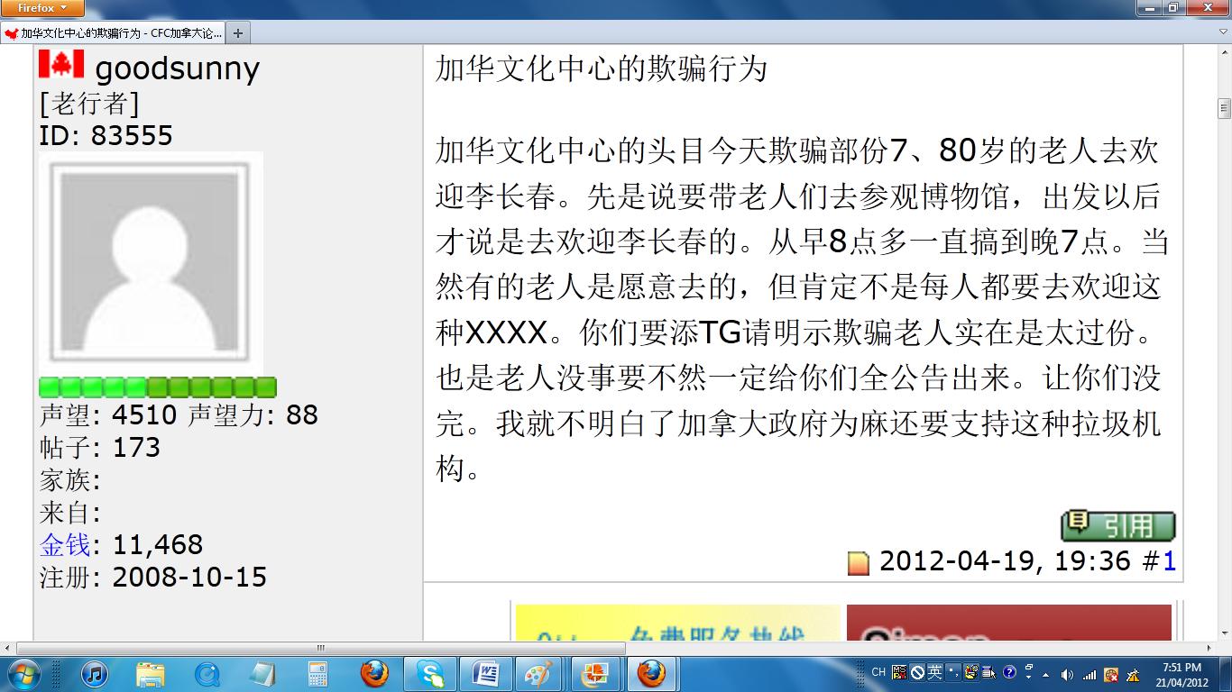 goodSunny的贴子还说:“当然有的老人是愿意去的,但肯定不是每人都要去欢迎这种×××。你们要添(舔)TG请明示欺骗老人实在是太过份。也是老人没事要不然一定给你们全公告出来。让你们没完。我就不明白了加拿大政府为吗还要支持这种垃圾机构。”