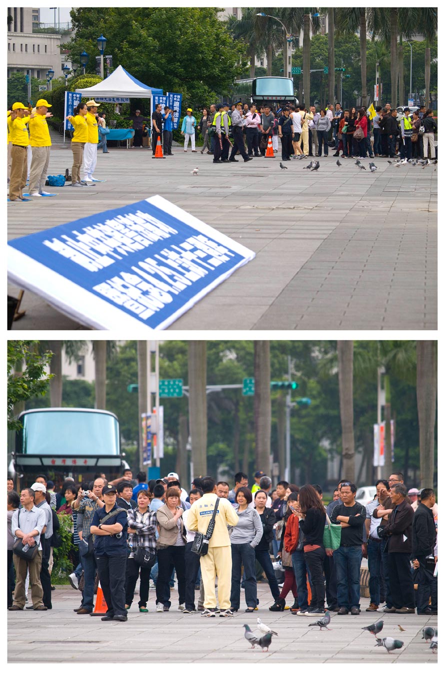 【明慧网二零一二年四月二十五日】(明慧记者方慧台湾台北报道)二零一二年四月二十二日下午,为纪念“四·二五”中国万名法轮功学员和平大上访十三周年,法轮功学员在台北自由广场举行反迫害讲清真相活动,揭穿中共谎言,吁共同制止迫害法轮功。一车车的大陆游客一下车就被眼前情景所震撼,这么多人在这里炼功,旁边还有警察看护着。