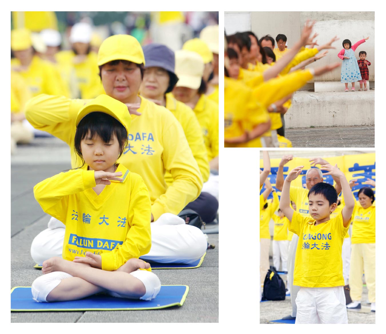 '法轮功的动作简单易学,适合各年龄层人学炼,有九十几岁的老人,也有二三岁的小娃儿。图为大法小弟子炼功情景。'