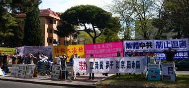 '纪念四·二五,西班牙法轮功学员中使馆前呼吁停止迫害'