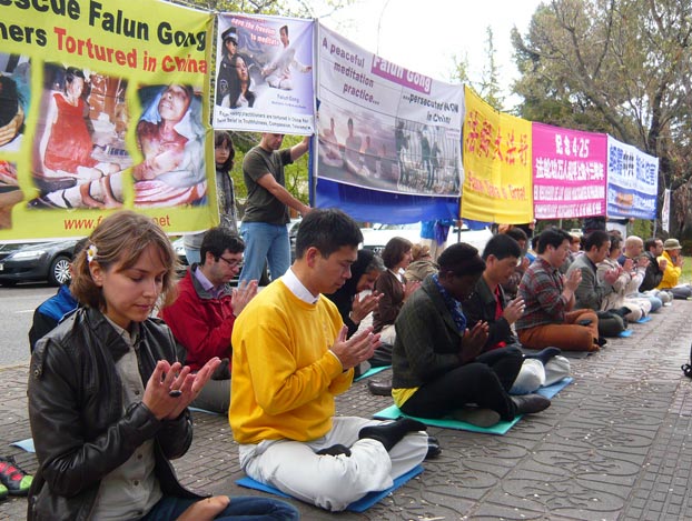 随着炼功音乐的响起,法轮功学员们开始演示优美舒缓的五套功法,这庄严而又祥和的场面吸引了所有过往行人的目光:行人停下脚步观看,取阅传单了解法轮功真相;过往车辆在这里自行减速,想尽量看清楚横幅上面的字和反迫害图片,他们想知道这里发生了什么。发传单的学员们也尽量不落下每一个路过这里的人,他们将真相传单递到每一个路人手中,每遇红灯车辆停下时,学员们马上过去将真相递到每辆车中,而车内的人都会立刻摇下车窗接受真相传单。一些没有遇到红灯而无法停下的车会鸣笛致意,有的则伸手做出V字形手势以示支持。