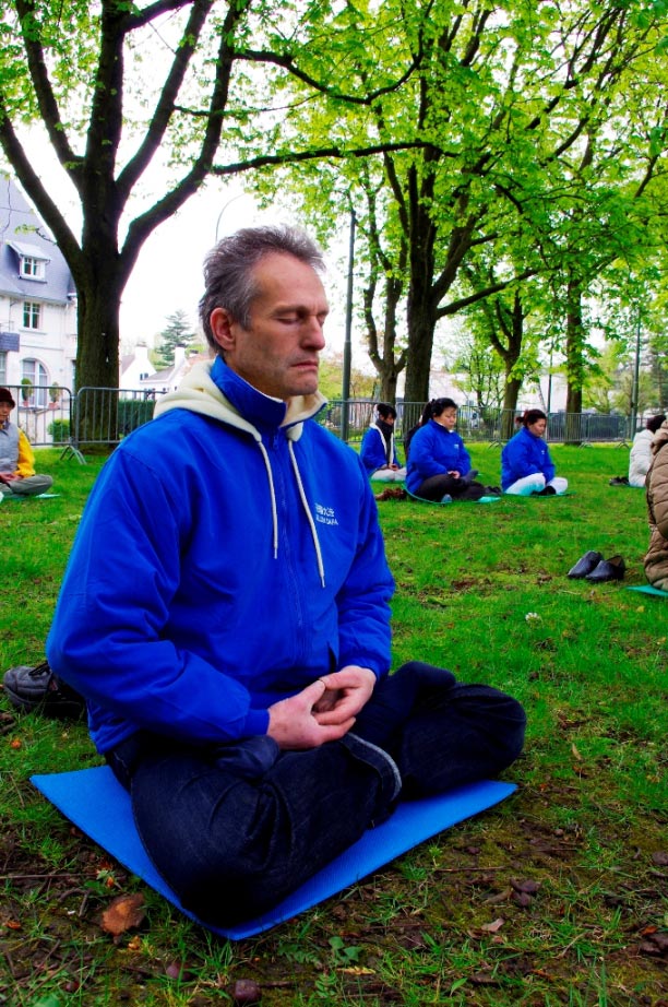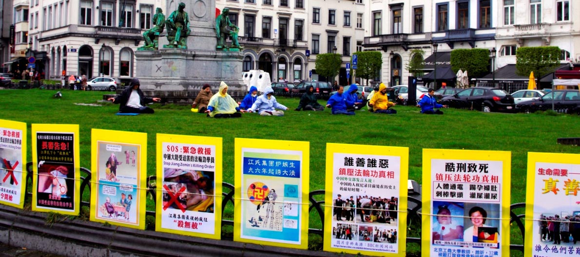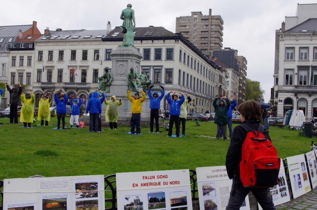 在当天一早,比利时学员来到中领馆前集体炼功,并打出:“法轮大法好”,“纪念法轮功四·二五和平上访十三年”,“中共必须停止迫害法轮功”,“法办江泽民、周永康、罗干、刘京”等大量的横幅。
