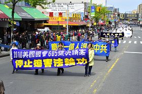 参加游行的队伍还有很多支持法轮功的民众。在游行队伍的最末尾,各界民众“支持法轮功”的巨大横幅和旗帜处处舞动,参加游行的“中国基督教民主党”发言人陆东表示,从二零零七年该党成立以来,他们尽力参加法轮功反迫害活动,因为基督徒在中国也在受迫害,所以他们一定要和法轮功站在一起,反抗迫害。而作为生活在自由社会的人,如果还不敢要求自由、唤醒国内的民众,那是自己的失职。