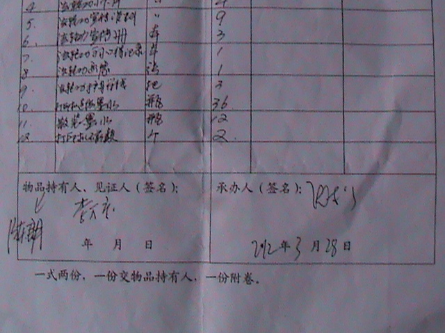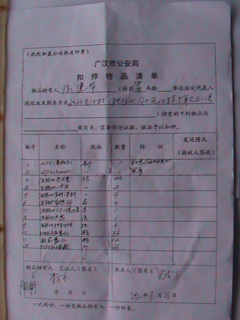 所有被绑架的同修都被非法抄家。把抄出的有关大法的物品非法带走,在非法扣押物品清单上承办人不敢签名,签了的根本无辨认(后附《扣押物品清单》照片)。在搜查陈建华家时,陈的家人要求恶警出示警察证件或警号,并正告恶人他们的行为违法,会就他们的违法行为起诉他们。恶警说:你要去哪告都随便你。然后继续行凶。