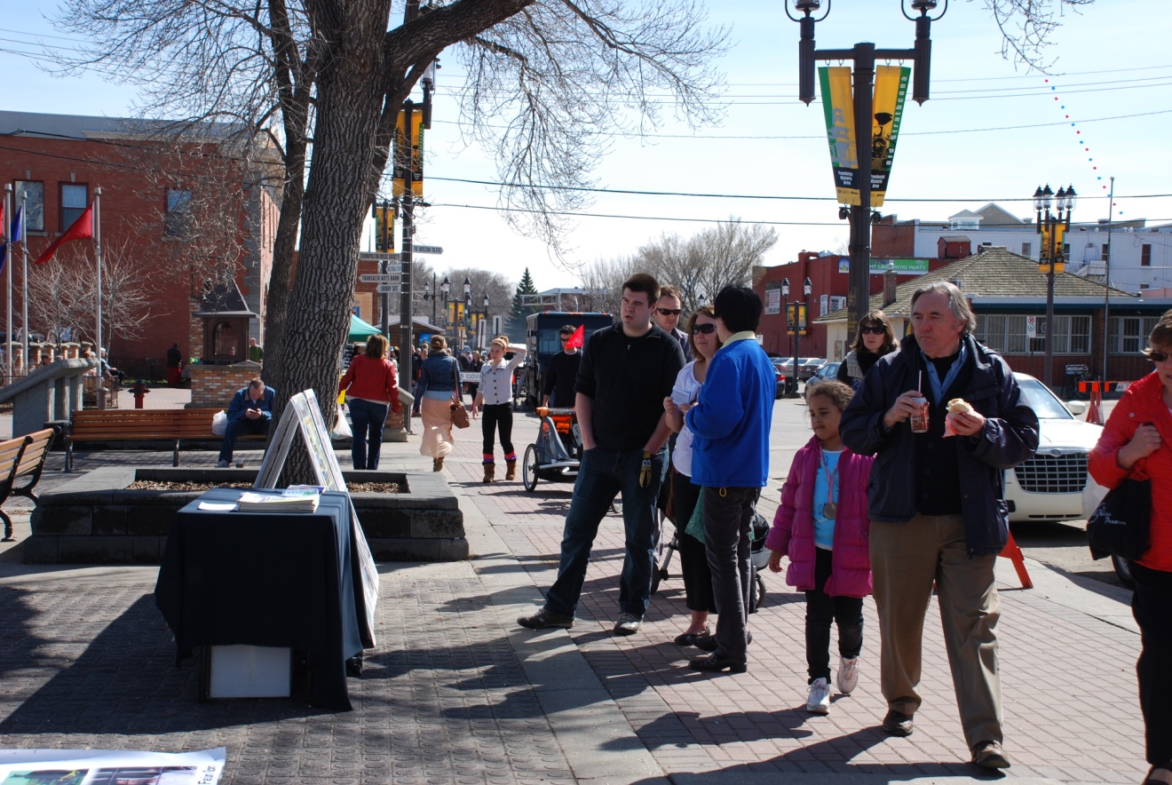 【明慧网二零一二年四月三十日】二零一二年四月二十八日清晨,连日雨雪的天空放了晴,湛蓝的天空像被清洗过一样,偶尔挂着几朵白云。埃德蒙顿法轮功学员聚集在人来人往的农贸市场旁的公园,在公园里打出“法轮大法好”、“纪念4.25法轮功学员和平上访”、法办江泽民、罗干、刘京、周永康”、“终结共产暴政、结束中华苦难”等横幅,并摆上介绍法轮功真相的展板和资料。