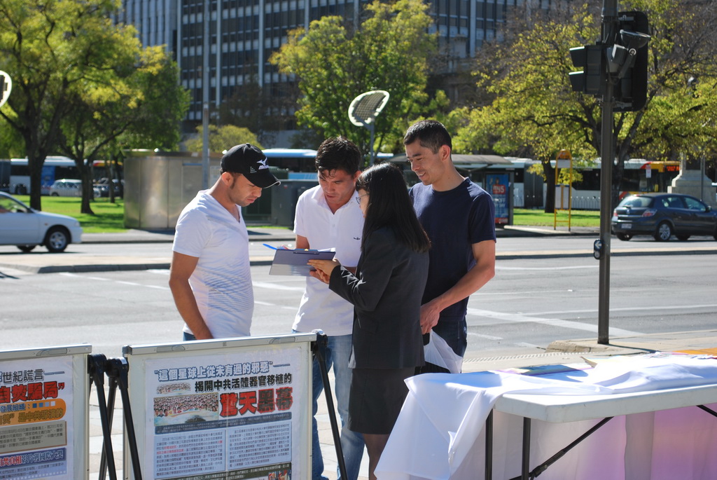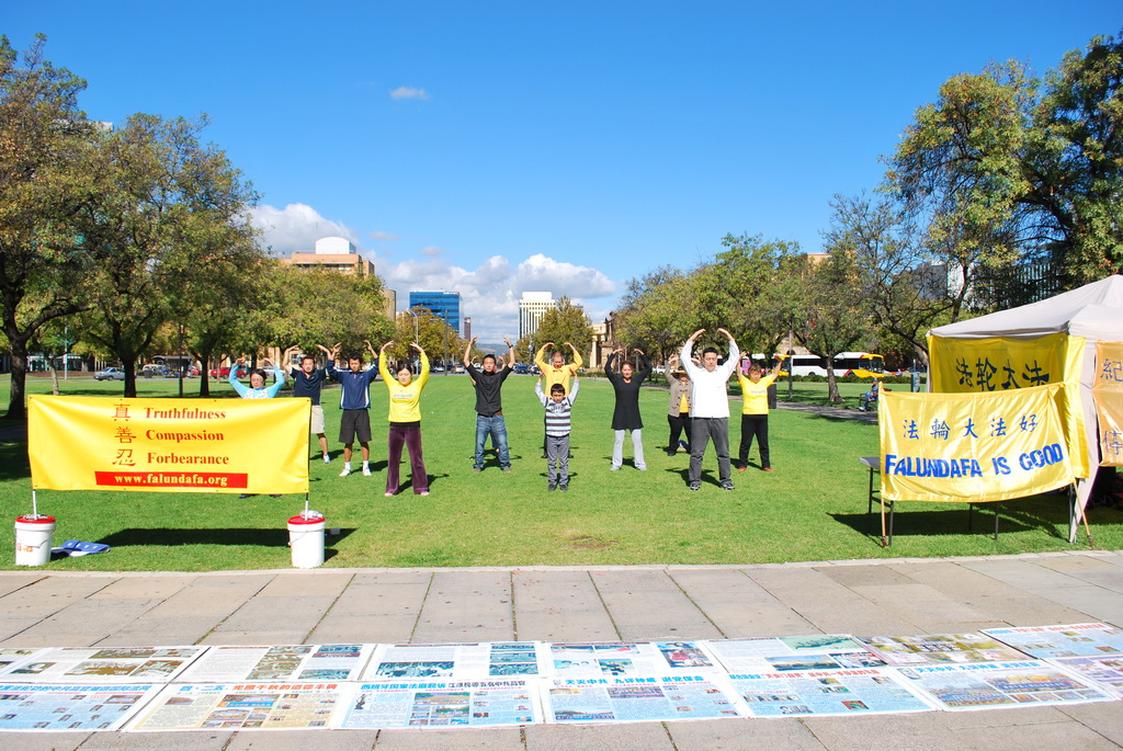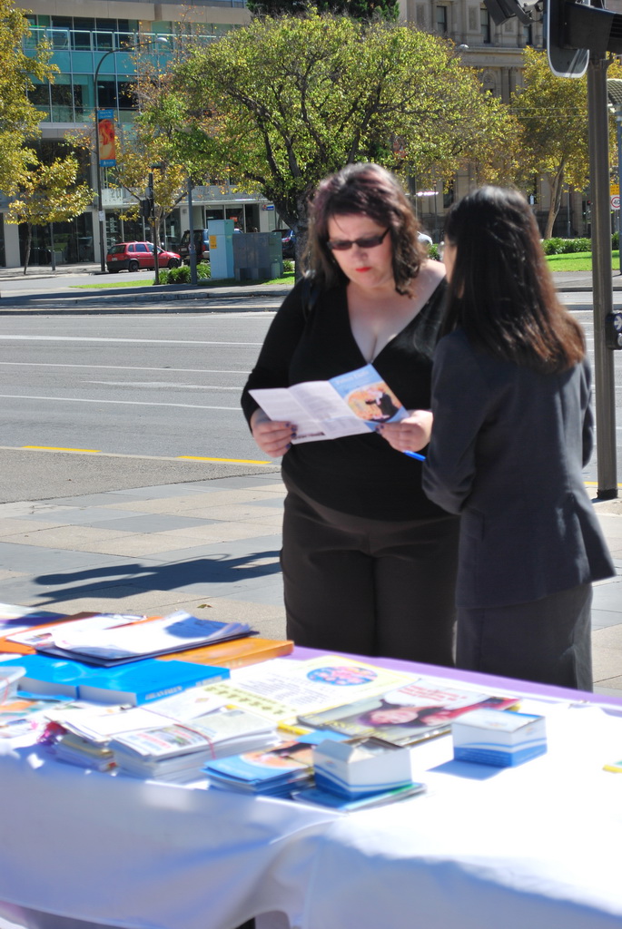 二零一二年四月二十八日,南澳法轮功学员在维多利亚广场摆展板,帮助人们回顾历史真相。路过的行人被学员宁静祥和的炼功场面吸引。人们仔细地看展板,找寻真相。当人们了解了天安门广场的镇压时,几乎都不约而同的说:“因为坚持自己的信仰就遭到迫害,真是太可怕了。中国的人权状况太恶劣了。”