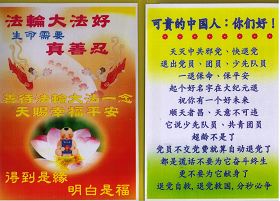 后来这个同修要外出三、四天,同修叫我去帮看真相点,正好认识两个同修都不是在大陆和香港出生、长大的,也不大懂汉字的,但她们看到我劝三退她们也想退,我就分别送一个A4尺寸大的真相展板给她们,并告诉她们方法:“你们不懂写中文不要紧,预先叫懂中文的同修先起好名字或化名,在一张纸里男的名字在一边,女的名字另一边,你左手拿着真相展板,右手拿着一支笔,有人看或想看,你就跟他(她)打招呼,先生或姐姐您好!请看:就用笔一个字、一个字,一句、一句的点给他(她)看,先用笔点:法轮大法好!天赐幸福平安!这个图片,看完了;再用笔点:天灭中共邪党……退出党员、团员、少先队员。这个图片又看完了,你就问他(她)明白啦!他(她)说:明白了。是男的你就点个男的名字;女的你就点个女的名字给他(她),看到对方表示同意了;再用笔点着退出少先队、团员、党员问?有什么就帮他(她)退什么,同时把退队写在他(她)名字的旁边,你不懂写中文,可同数字代替,退队用(1),退团队用(2),退党团队用(3)。这样就行了。”