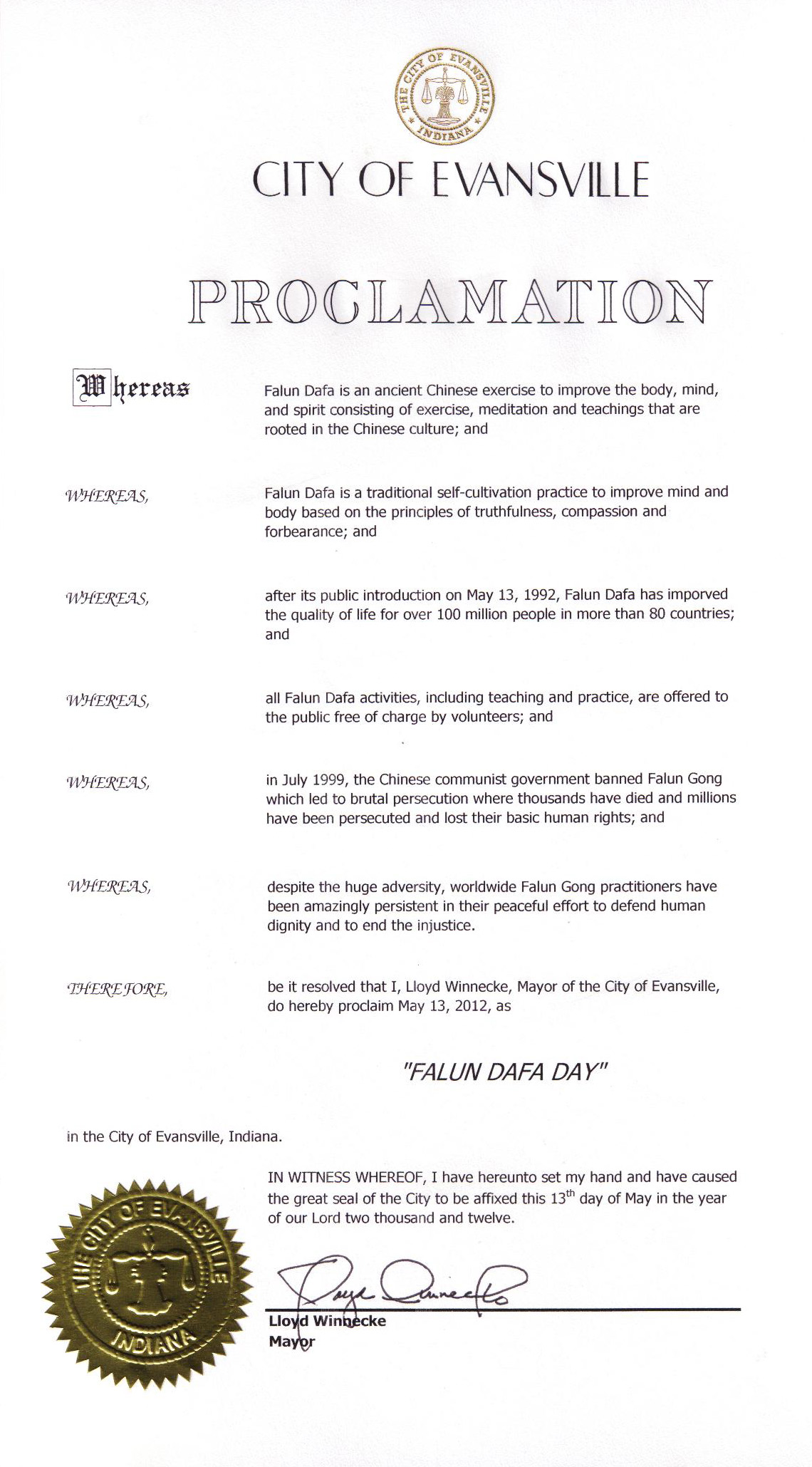 【明慧网二零一二年五月十日】美国印第安纳州埃文斯维尔市(Evansville,Indiana)市长劳埃德·温内克 (LIoyd Winnecke)于近日颁发褒奖令,褒奖法轮大法,宣布二零一二年五月十三日为印第安纳州埃文斯维尔市法轮大法日。