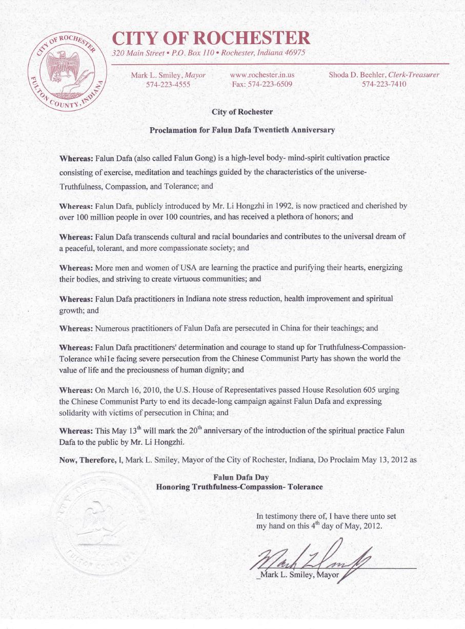 【明慧网二零一二年五月十日】美国印第安纳州罗切斯特市(Rochester,Indiana)市长马可·思麦力(Mark L. Smiley)于近日颁发褒奖令,褒奖法轮大法,宣布二零一二年五月十三日为印第安纳州罗切斯特市法轮大法日,颂扬真、善、忍。