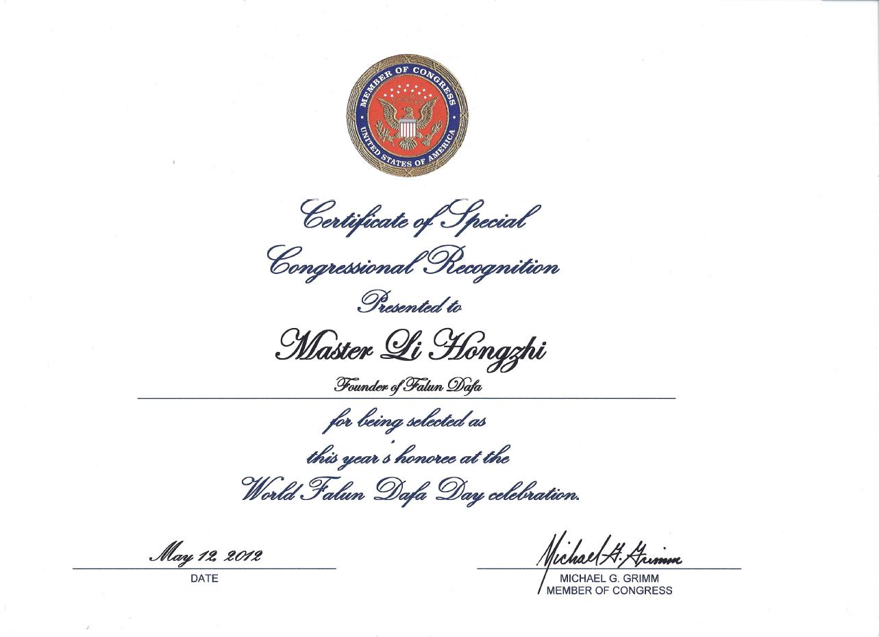 【明慧网二零一二年五月十日】为庆祝世界法轮大法日,美国纽约州第十三区国会议员麦克·格里姆(Michael Grimm)颁发特别嘉奖给法轮大法创始人李洪志大师。