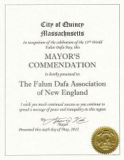 【明慧网二零一二年五月十日】为庆祝即将来临的第十三届世界法轮大法日,美国麻州昆西市市长托马斯·寇奇(Thomas Koch)颁发褒奖,并祝愿新英格兰法轮大法学会继续在本地区传播和平信息并不断取得成功。