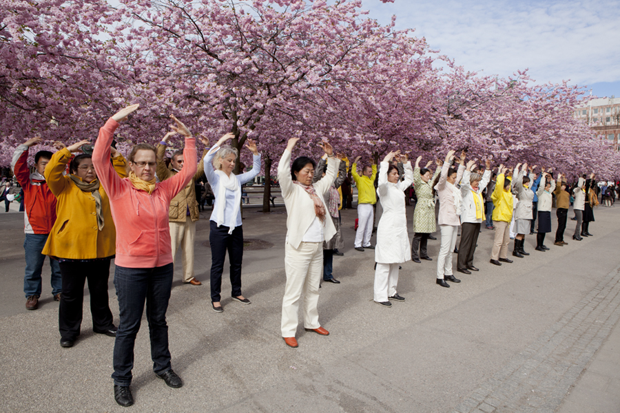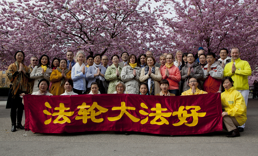 今年是法轮大法洪传世界二十周年,四月底五月初的瑞典斯德哥尔摩皇家公园正值樱花盛开时节。在这个普天同庆即将来临之际,四月二十八日瑞典法轮功学员聚集在皇家花园美丽的樱花树下、斯德哥尔摩壮观的市政厅前,用集体炼功的形式,庆祝即将到来的第十三届“世界法轮大法日”暨法轮功创始人李洪志师父的六十一华诞,全体学员合影感谢慈悲伟大的师尊的救度之恩。