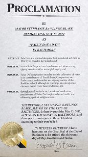 美国马里兰州巴尔的摩市市长斯蒂芬妮•罗林斯-布莱克于近日颁发褒奖令,褒奖法轮大法,宣布二零一二年五月十三日为马里兰州巴尔的摩市法轮大法日。