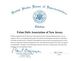 在法轮大法开传二十周年之际,美国新泽西州国会众议员罗德尼•弗瑞林汉森(Rodney Frelinghuysen)为新泽西法轮大法学会颁发国会表彰令。