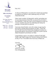 为庆祝即将到来的法轮大法洪传世界二十周年,美国明尼苏达州明尼阿波利斯市市长R.T. Rybak致信当地法轮功学员,祝贺法轮大法月,并谴责中共对法轮功的迫害。
