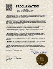美国密苏里州大学城市长雪莉•威尔士于二零一二年五月签发褒奖令,褒奖法轮大法为世界带来了和平与美好。