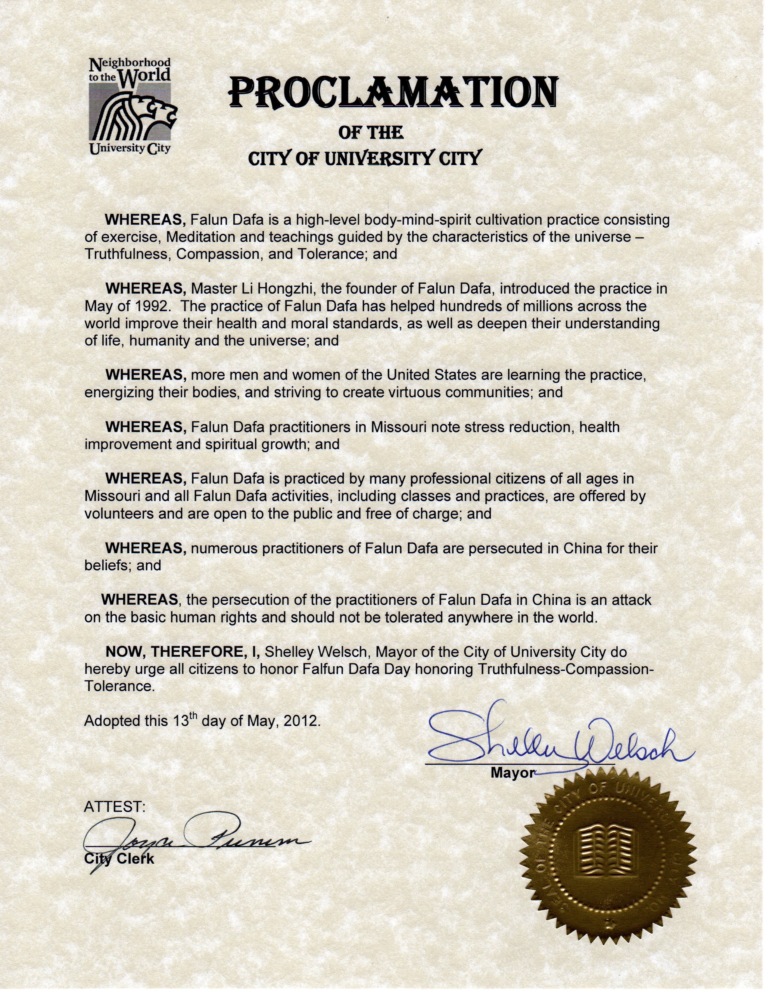 【明慧网二零一二年五月十二日】美国密苏里州大学城(University City)市长雪莉•威尔士(Shelley Welsch)于二零一二年五月签发褒奖令,褒奖法轮大法为世界带来了和平与美好。