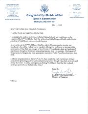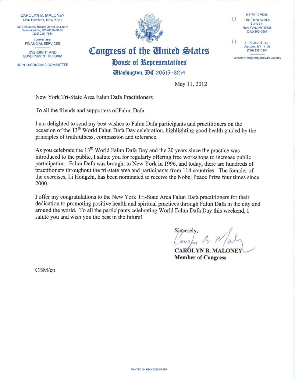 【明慧网二零一二年五月十二日】美国纽约国会议员卡罗琳•马洛尼(Carolyn Maloney)二零一二年五月十一日致信当地法轮功学员,祝贺法轮大法日的庆祝。