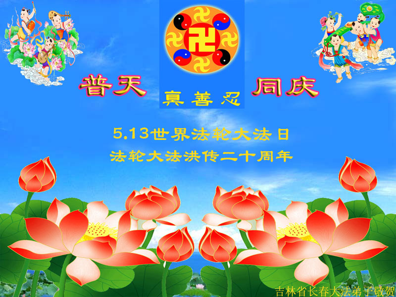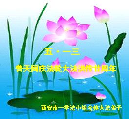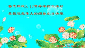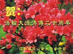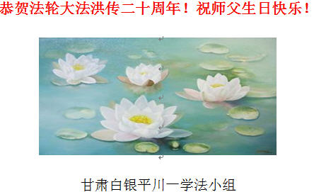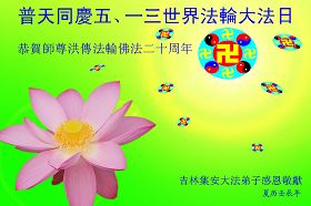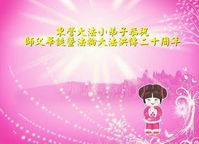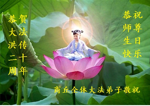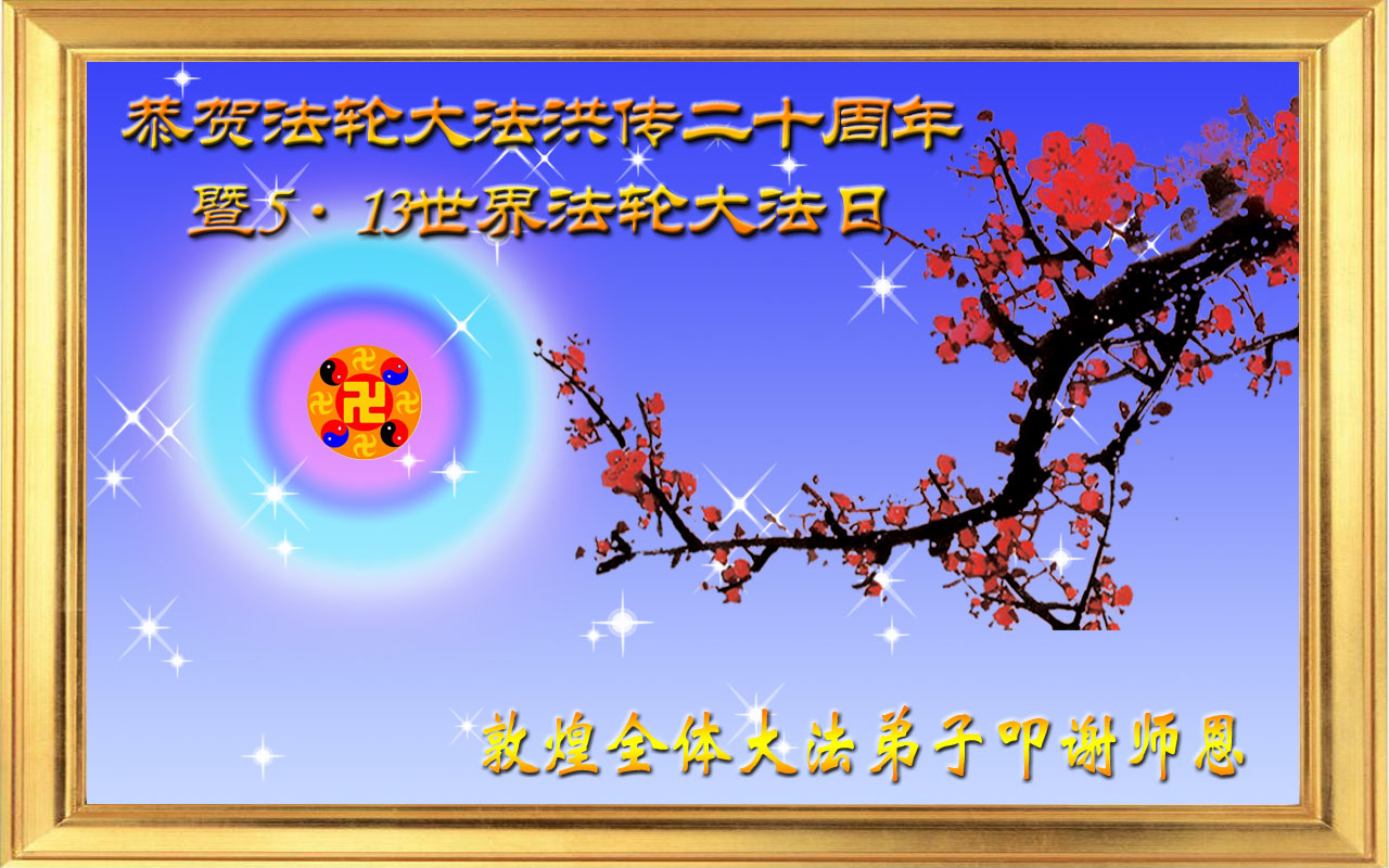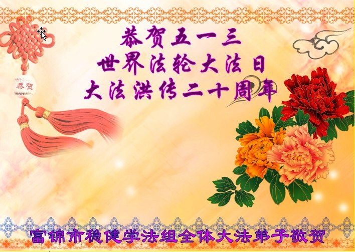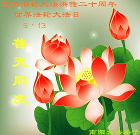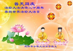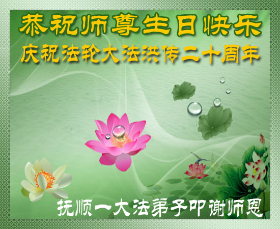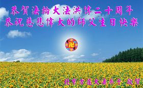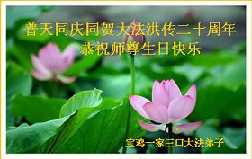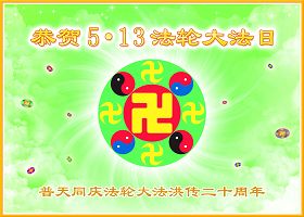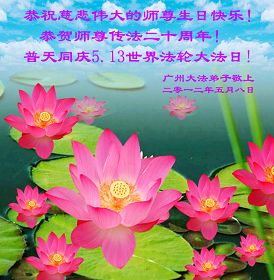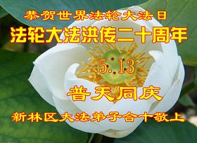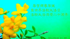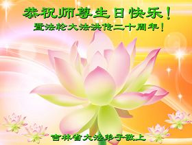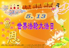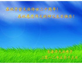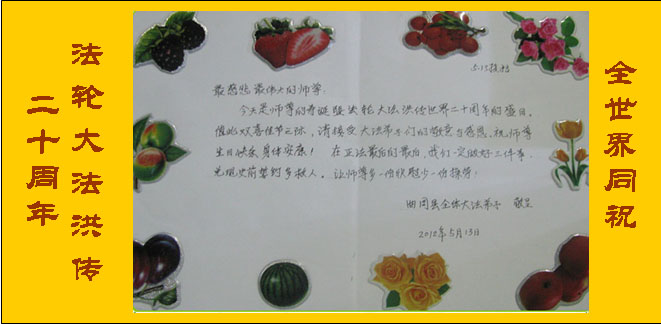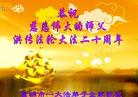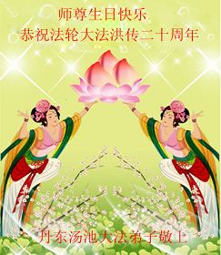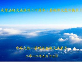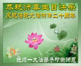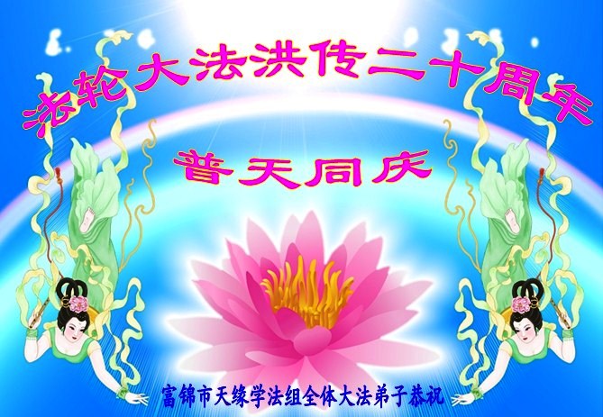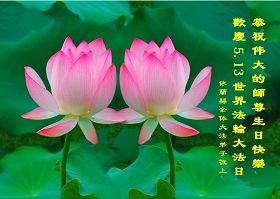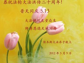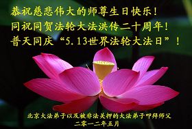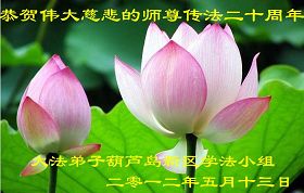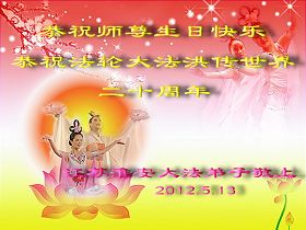 在这普天同庆法轮大法二十周年及世界法轮大法日的美好日子里,我们夫妻大法弟子一定要学好法,做好三件事,决不辜负师尊的慈悲苦度。